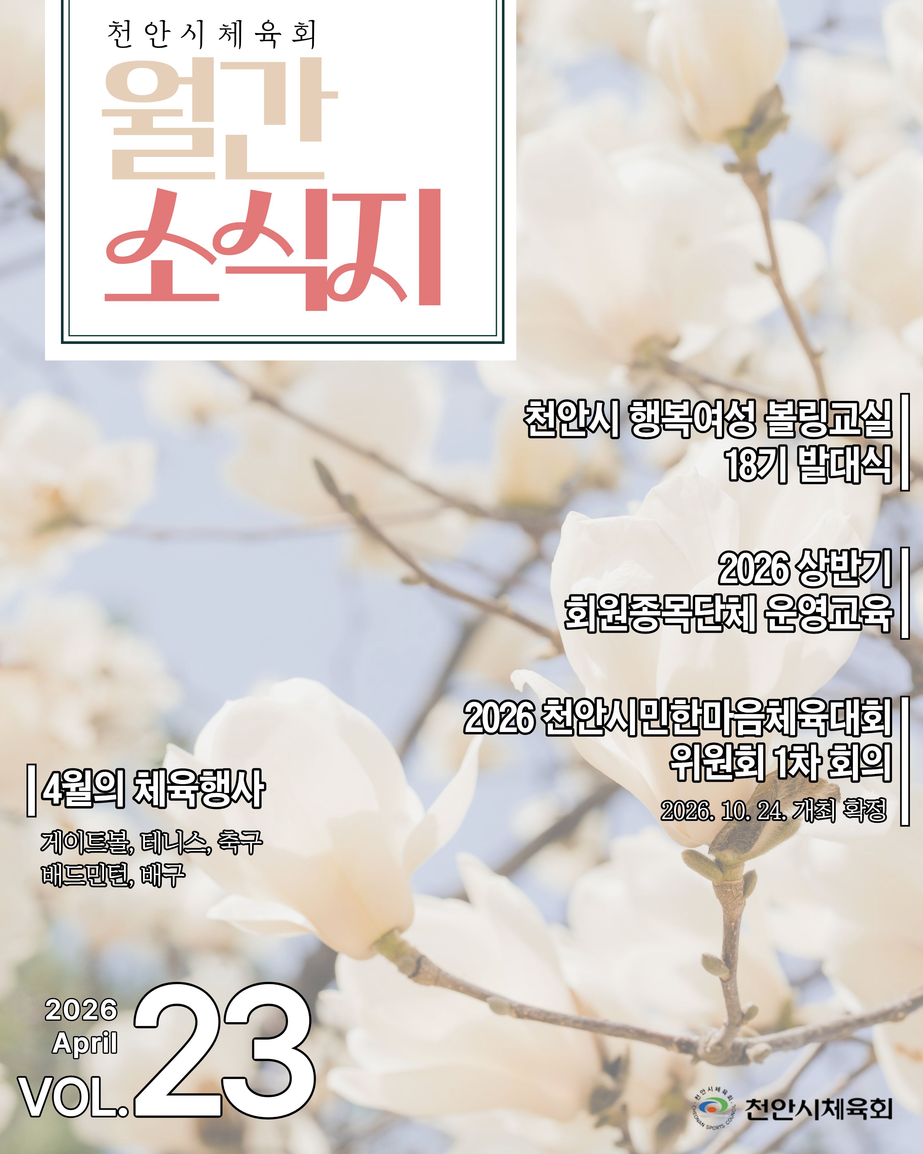 부서안내 관련규정 체육단체 경기결과 공지사항 + 천안 청춘스포츠교실 수강생 모집 (게이트볼, 그라운드골프)[2026-04-15]2026년 신나는 인라인 슝슝스쿨(5~6월) 수강생 모집공고[2026-04-10]2026년 상반기 생활체육프로그램 수강생 추가모집 안내 [2026-04-10]천안 청춘스포츠교실 수강생 모집 (당구, 소도구 필라테스) [2026-04-07]2026년 상반기「천안시 배구아카데미 교실」수강생 모집안내[2026-03-11] 보도자료 + 천안시체육회, 2026년 상반기 회원종목단체 운영 교육 실시[2026-04-01]천안시체육회, 2026년 주요업무 보고회 개최[2026-01-21]'2025 천안·아산 교류전' 성료...상생·화합 다짐[2025-11-10]천안시체육회-천안동남경찰서, 위기청소년 대상 ‘스포츠 체험’ 운영[2025-11-10]제4회 천안 이봉주마라톤대회 대성황...6천여명 열정으로 달리다’[2025-11-10] 현장수업 신청 및 현황+ 천안시체육회 2026년 4월 어르신지도자 수업현황[2026-04-01]천안시체육회 2026년 4월 일반 및 유소년지도자 수업현황[2026-04-01]천안시체육회 2026년 3월 어르신지도자 수업현황[2026-03-04]천안시체육회 2026년 3월 일반 및 유소년지도자 수업현황[2026-03-04]천안시체육회 2026년 2월 어르신지도자 수업현황[2026-02-02] 체육단체 천안시체육회를 구성하고 있는 회원종목 단체 자세히보기 생활체육 천안시민 누구나 쉽게 참여하고 다양한 신체활동을 통하여 건강하고 질 높은 삶의 스포츠 복지 자세히보기 지원사업 스포츠 복지와 전문체육인 발굴 · 육성을 통하여 스포츠 발전 및 국위선양 도모 자세히보기 체육회소식지 천안시체육회의 새로운 소식을 전합니다 ✉️ 월간 소식지 (2026-4월호) 2026년 제2차 천안시체육회 이사회 ✉️ 월간 소식지 (2026-3월호) 건강ㆍ체력상식 스포츠인권포털 선수고충처리센터 생활체육정보포털 회원종목단체 천안시체육회의 회원종목단체를 소개합니다 걷기협회 게이트볼협회 골프협회 카라테연맹 국학기공협회 그라운드골프협회 농구협회 댄스스포츠협회 럭비협회 레크레이션협회 롤러스포츠연맹 무에타이협회 배드민턴협회 보디빌딩협회 볼링협회 사격연맹 산악연맹 생활무용협회 수상스키-웨이크스포츠협회 수영연맹 수중핀수영협회 스쿼시연맹 스키협회 승마협회 역도연맹 야구-소프트볼협회 요가협회 우슈협회 유도회 육상연맹 자전거연맹 족구협회 줄넘기협회 줄다리기협회 철인3종협회 축구협회 치어리딩협회 킥복싱협회 탁구협회 테니스협회 파크골프협회 패러글라이딩협회 피구연맹 합기도협회 해동검도협회 검도회 태권도협회 레슬링협회 복싱협회 궁도협회 배구협회 당구연맹 양궁협회 주짓수협회 회원종목단체 바로가기