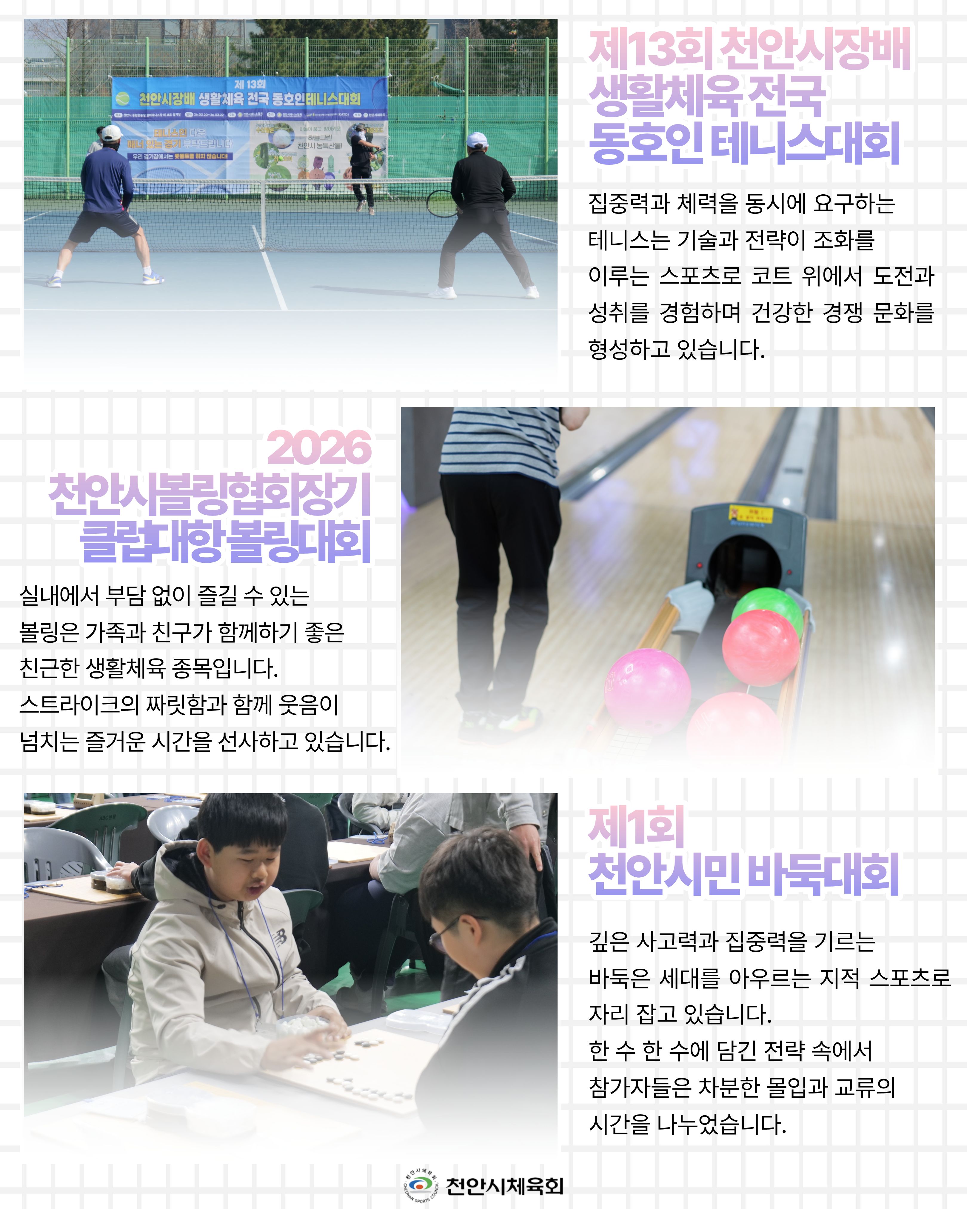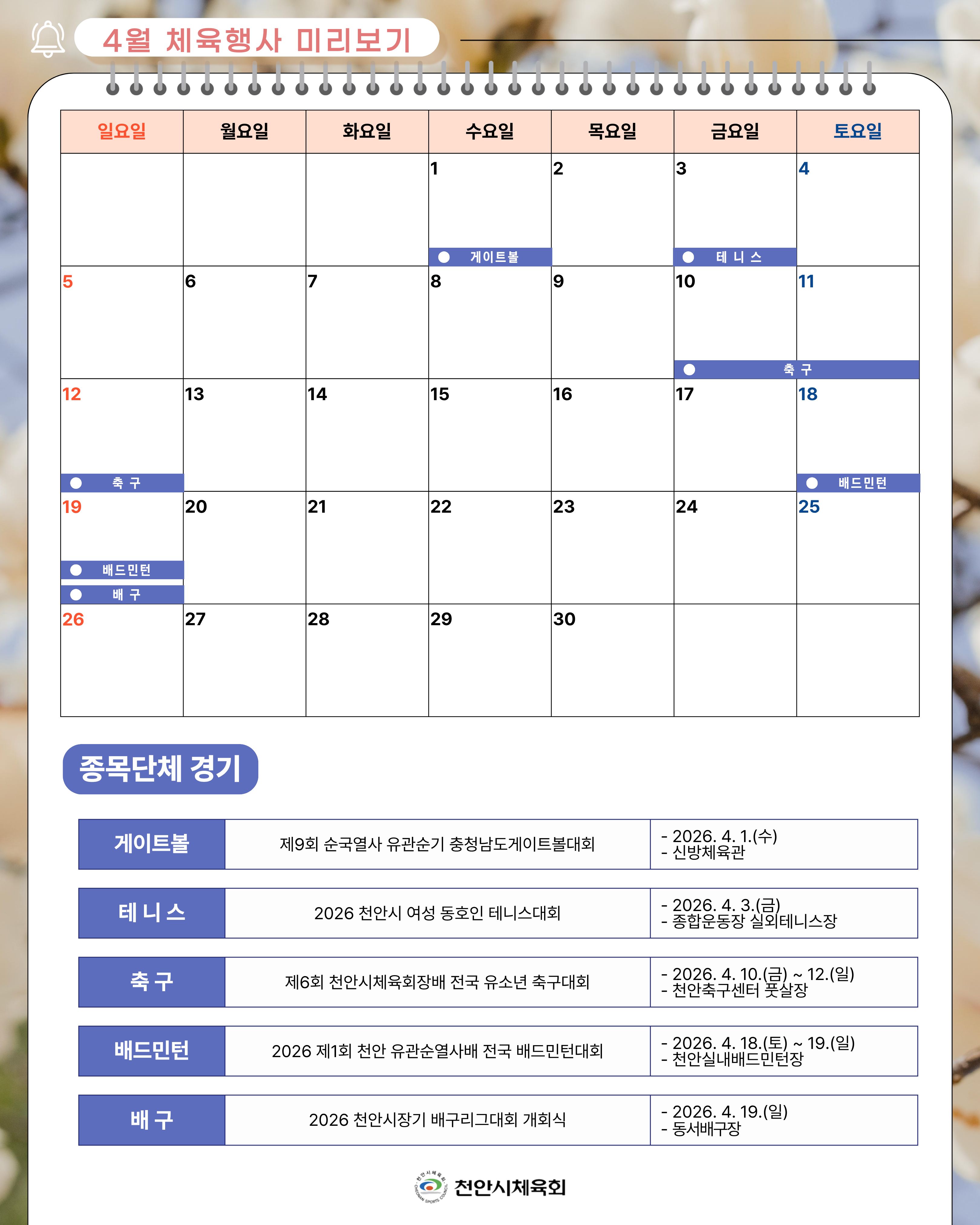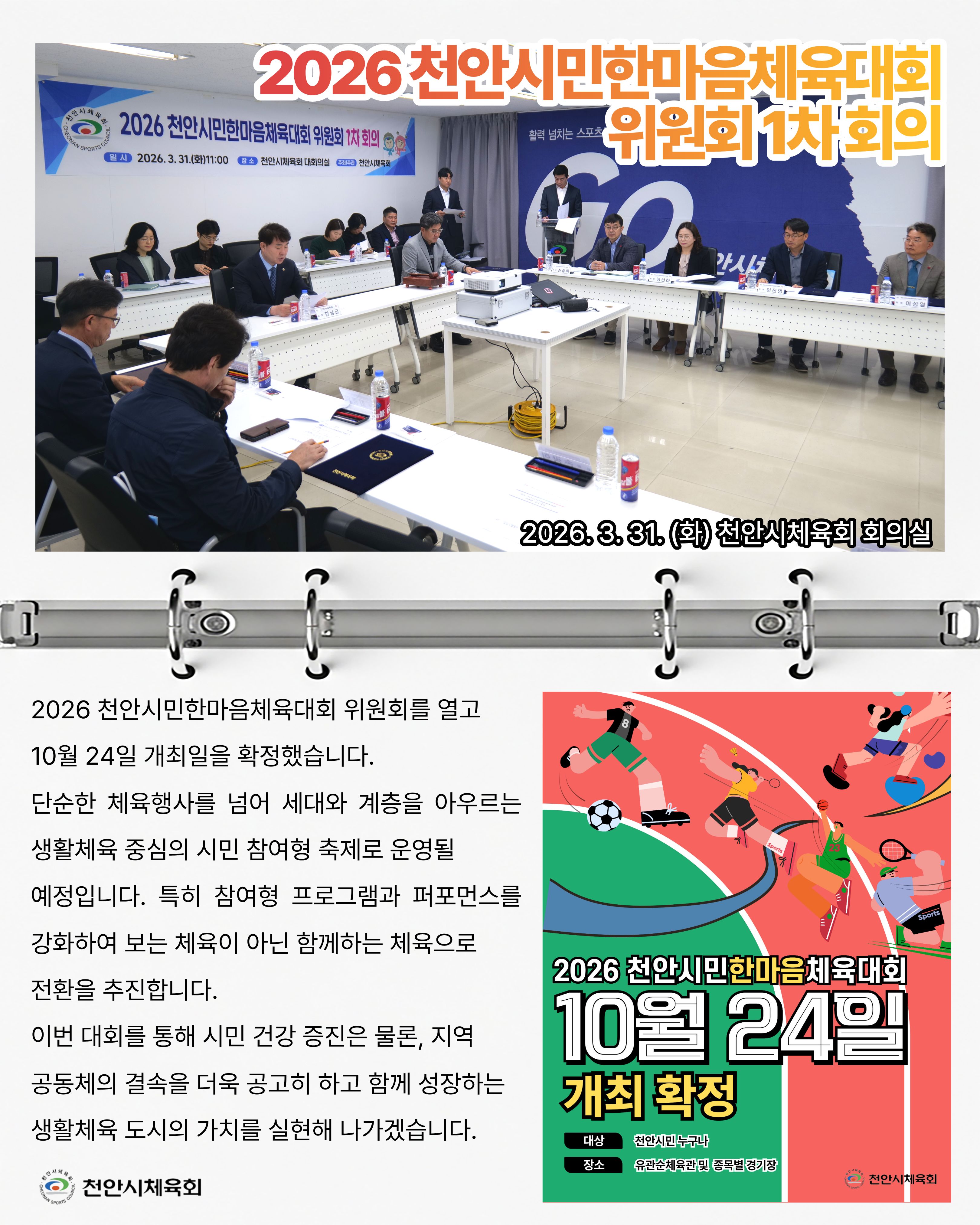 정보알림 공지사항 주간업무 체육회소식지 보도자료자료실 채용공고입찰공고 후보자 홍보자료 체육회소식지 글보기제목✉️ 월간 소식지 (2026-4월호)2026-04-09 11:24:26작성자관리자 태그 목록 -✉️ 월간 소식지 (2026-4월호)관리자2026-04-09다음2026년 제2차 천안시체육회 이사회관리자2026-04-03