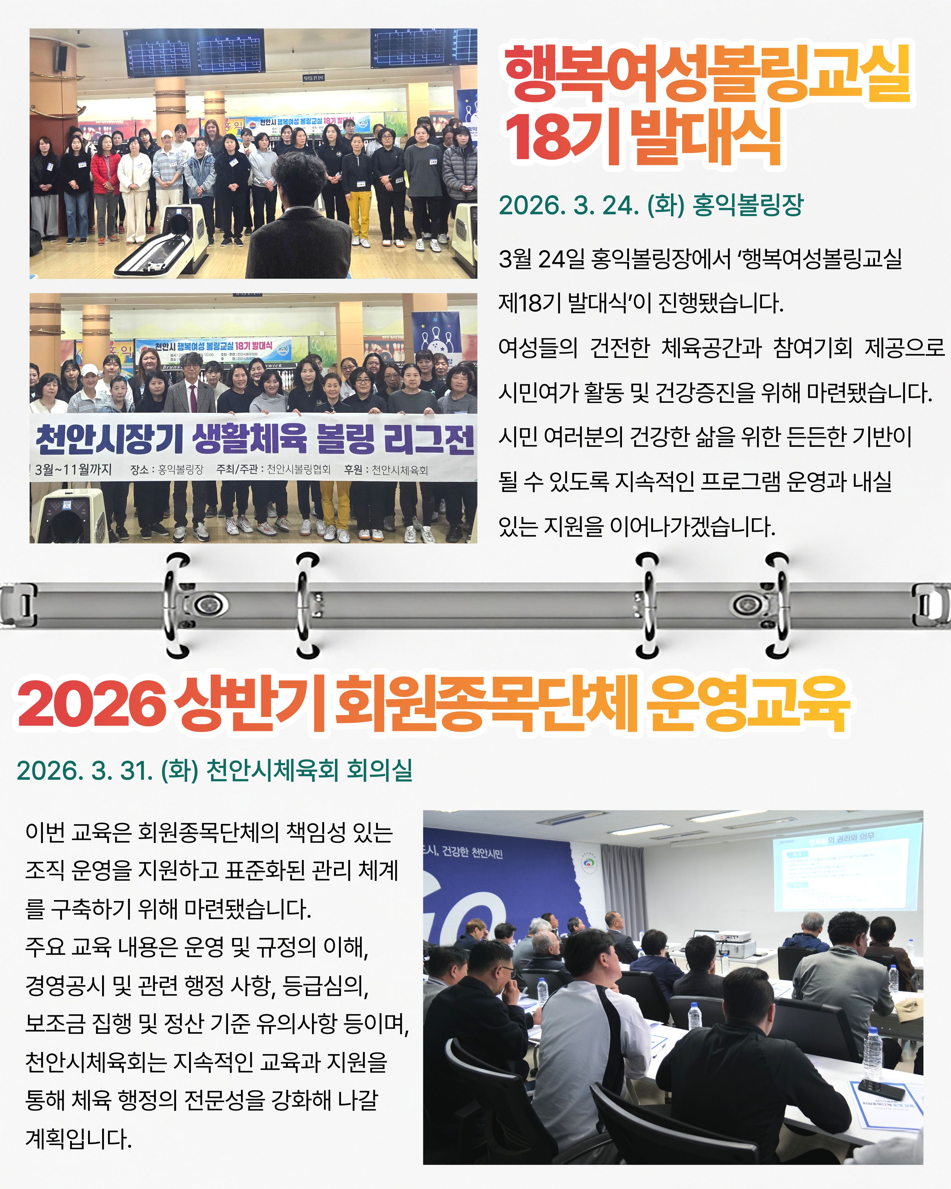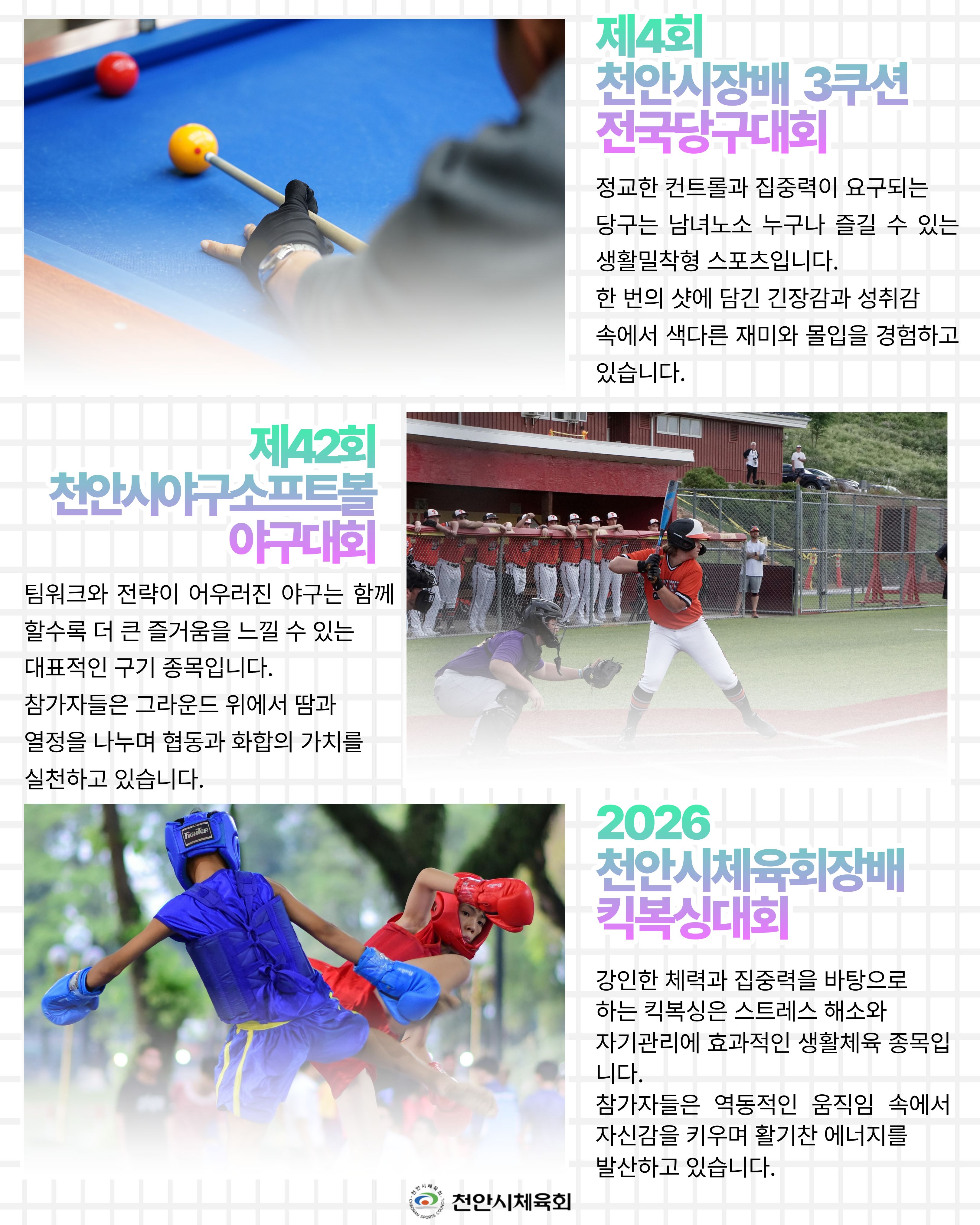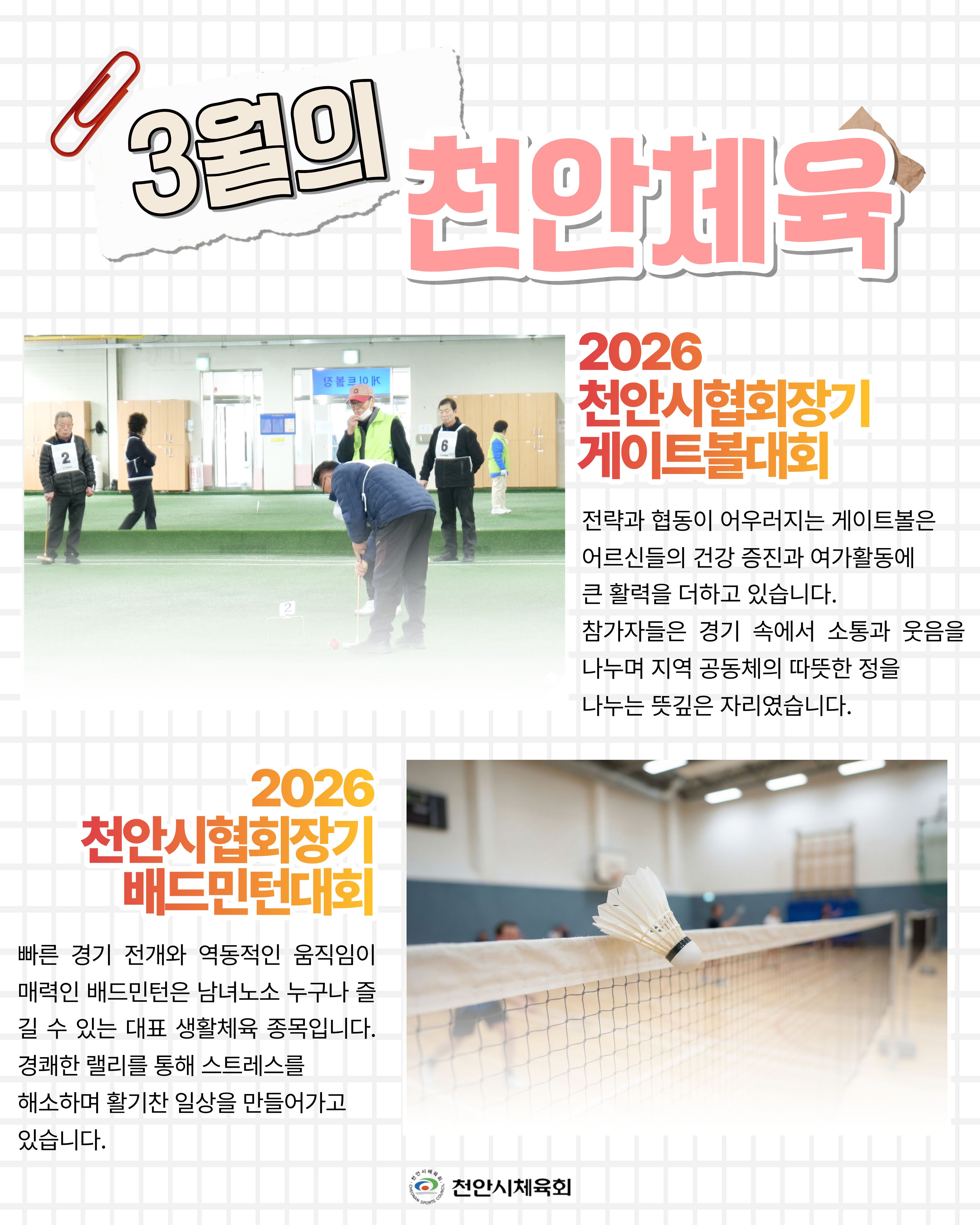정보알림 공지사항 주간업무 체육회소식지 보도자료자료실 채용공고입찰공고 후보자 홍보자료 체육회소식지 글보기제목✉️ 월간 소식지 (2026-4월호)2026-04-09 11:24:26작성자관리자 태그 목록 -✉️ 월간 소식지 (2026-4월호)관리자2026-04-09다음2026년 제2차 천안시체육회 이사회관리자2026-04-03