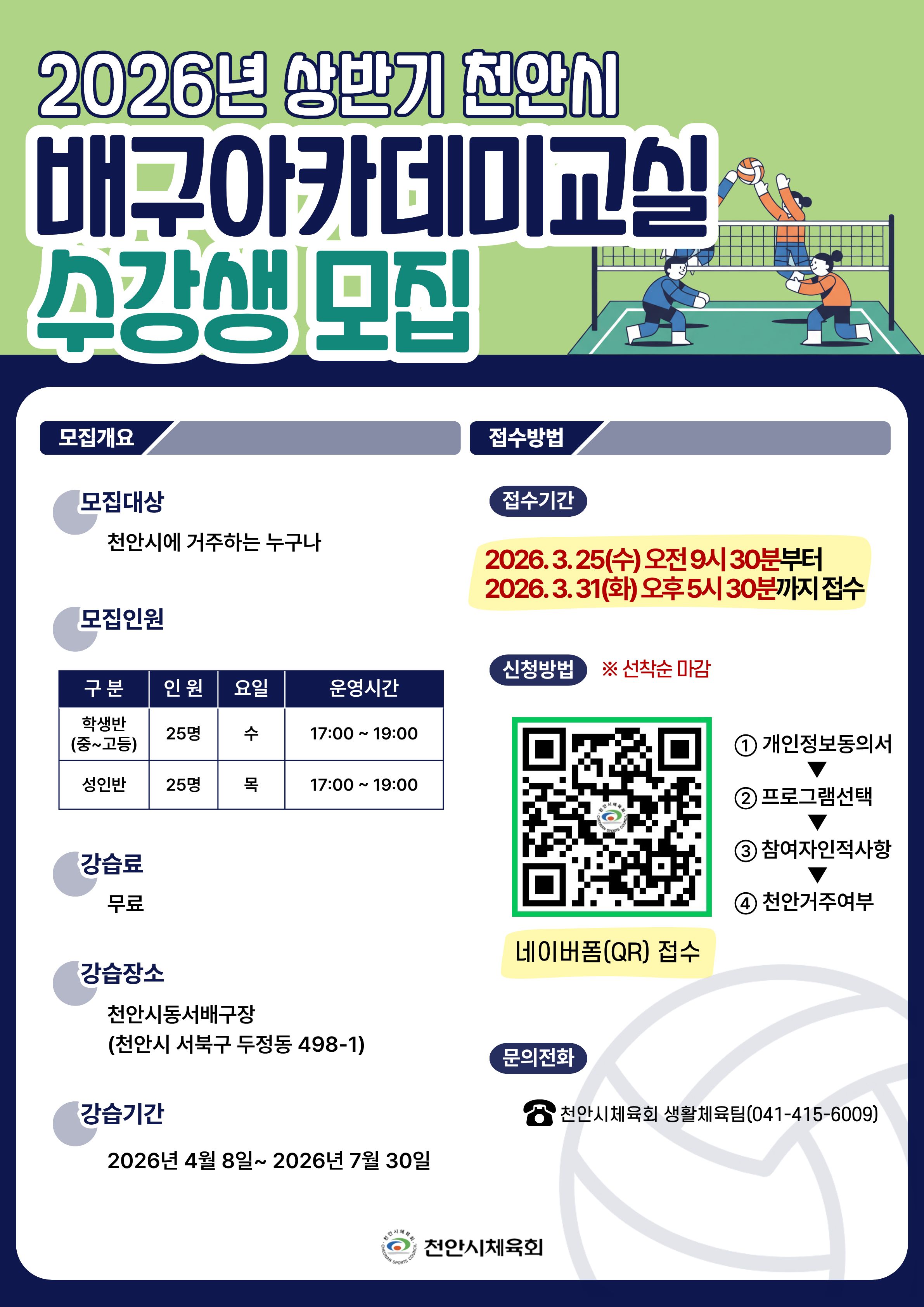 | - | 2026년 상반기「천안시 배구아카데미 교실」수강생 모집안내 | 관리자 | 2026-03-11 |